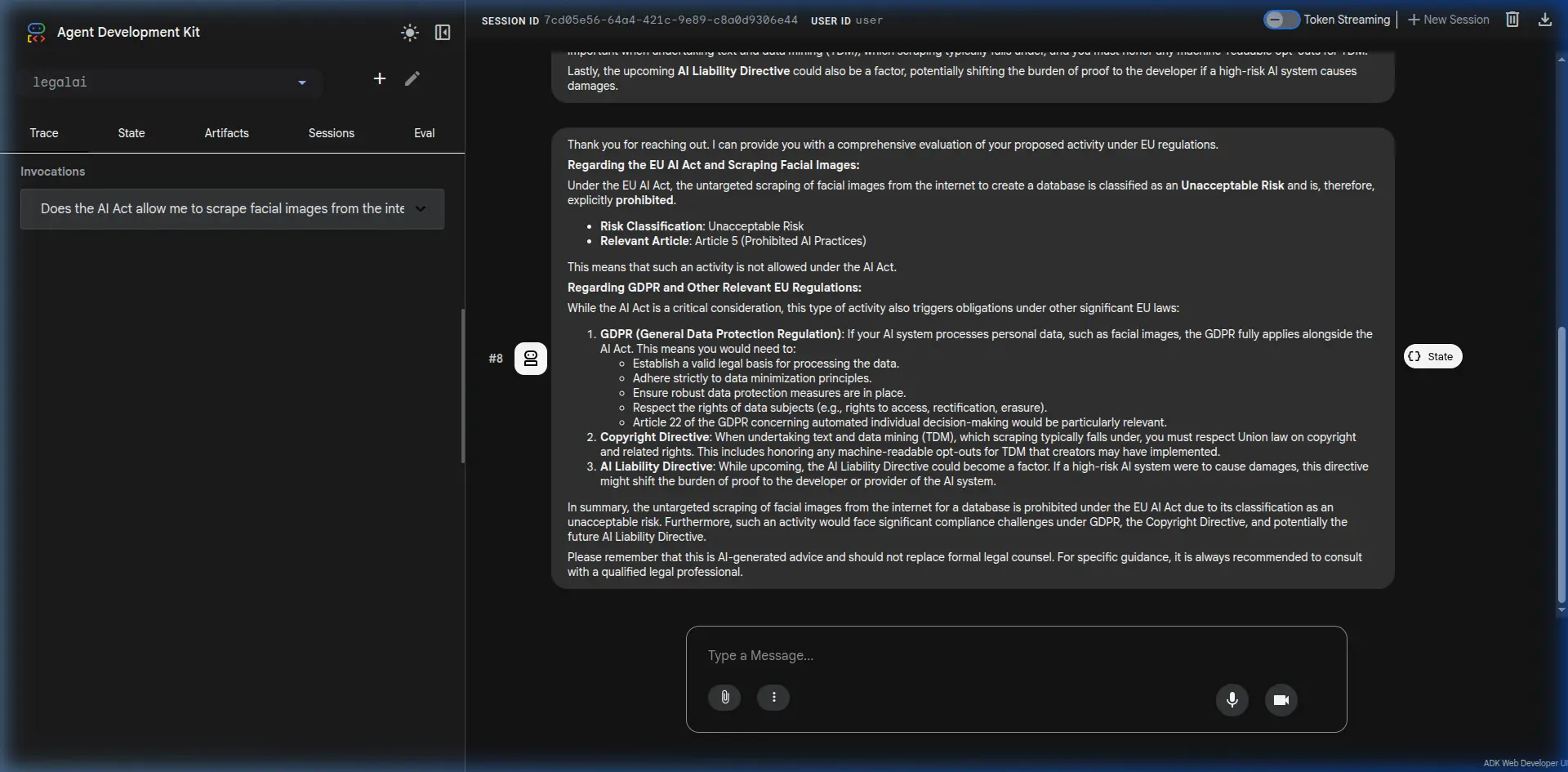 Welcome to the LegalAI tutorial! This project create an AI European law compliance application using Google Agent Development Kit (ADK) pipeline.