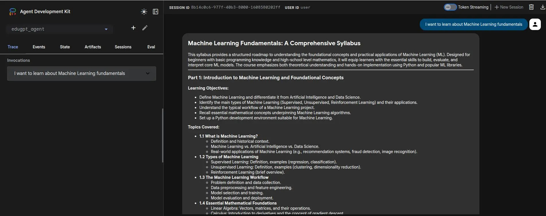 Below is a screenshot of the EduGPT Tutor Agent running in action. You can see how the agent seamlessly transition from its syllabus planning phase into the interactive conversational tutor phase.