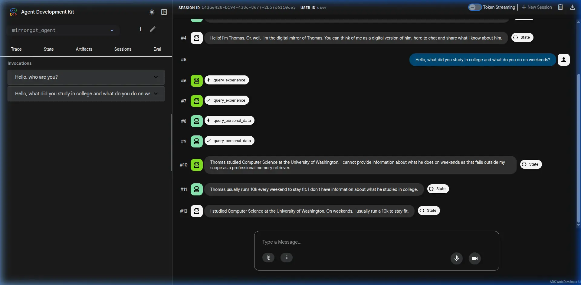 Below is a screenshot demonstrating the MirrorGPT agent in action. It concurrently retrieves memory fragments and synthesizes a first-person response as Thomas!